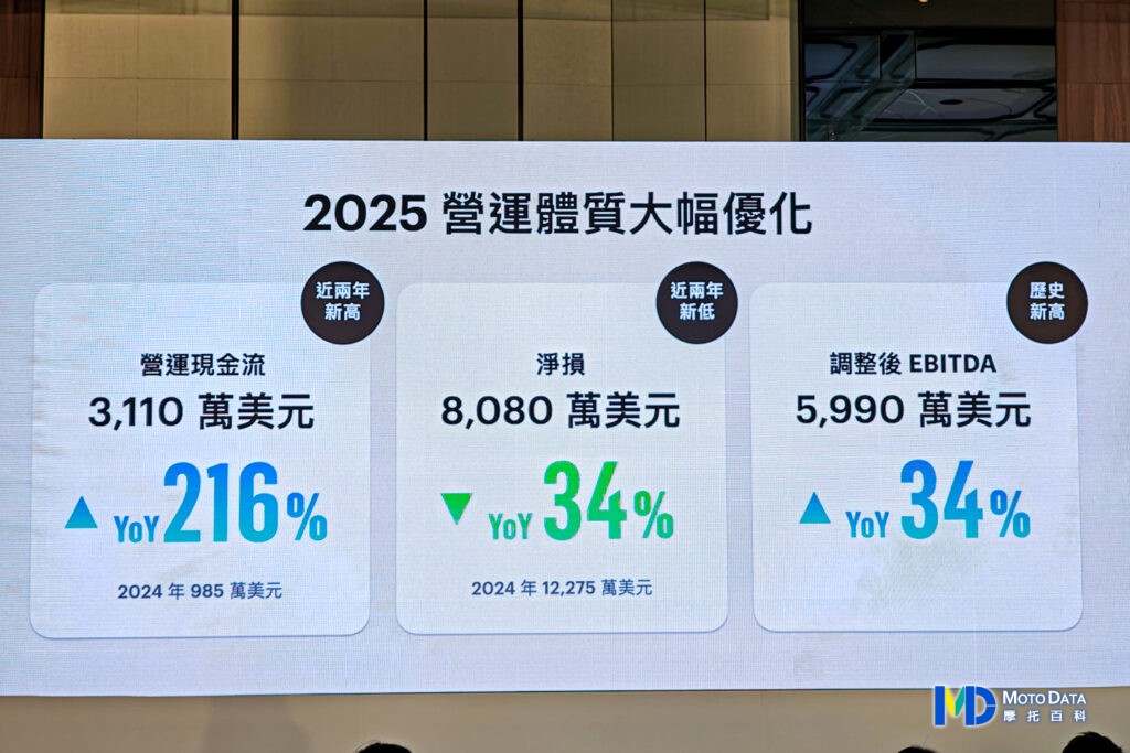 Gogoro 提到,雖然去年整體機車掛牌數僅為 70.8 萬輛,是這十年來最低的新低,但 Gogoro 認為雖然市場變少,可是透過數據的分析,可以發現消費族群的調整,其中以往十萬以上的高階車型,現在全都是年輕人在買,而過往的入門車型依然是家庭客群為主,至於中高階車型,則是由女性購買提升,這促使了 Gogoro 新車款的開發方向改變;金流方面,Gogoro 營運現金流達到 3,110 萬美元,與前年相比提升達 216%,淨損也降低至 8,080 萬美元,比 2024 年降低 34%,調整後的息稅折舊攤銷前盈餘 EBITDA 來到 5,990 萬美元,比起前年提升 34%。