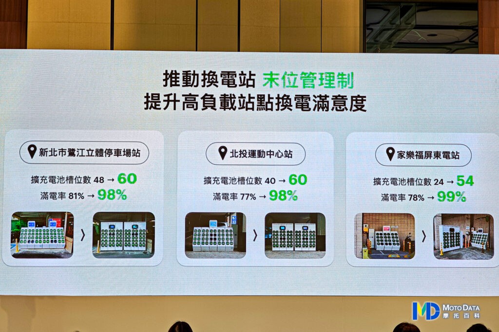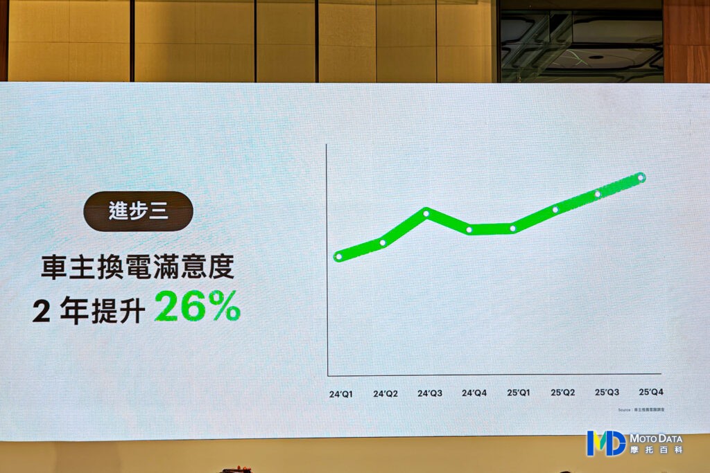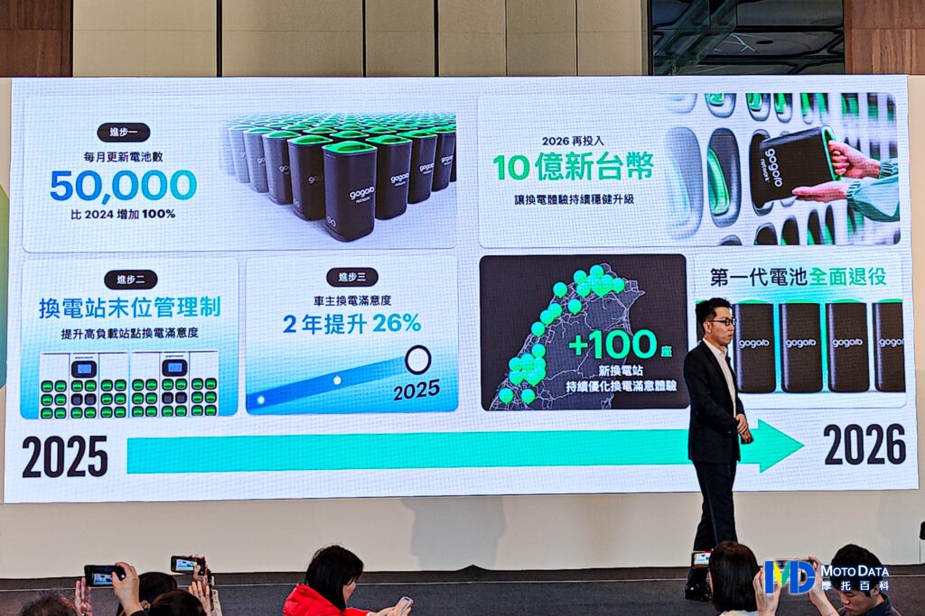 2025 年 Gogoro 能源業務方向經過多種調整與最佳化之後,在 2026 年 Gogoro 認為有三項進步,分別是 2025 年的每月電池更新數量達到 50,000 顆,比起 2024 年來說增加 100%,接著第二項進步則是換電站的滿意度提升,透過末位管理制度,舉例的新北市鷺江立體停車場站、北投運動中心站以及家樂福屏東電站等,不僅提升換電站槽位數量,也提升滿電率超過 95%,這兩年的改變讓第三項進步,也就是換電站的滿意度提升 26%,Gogoro 也預計在 2026 年持續投入十億新台幣在能源事業體系上,目標加速新增一百站以上,最重要的是一代電池終於官宣 2026 年底前退役,PBGN 車主終於可以避開低蓄電力的電池組,據詢問這些一代電池也將陸續進入燈號控制箱、智慧收費停車柱等持續運作,直到完全無法蓄電。