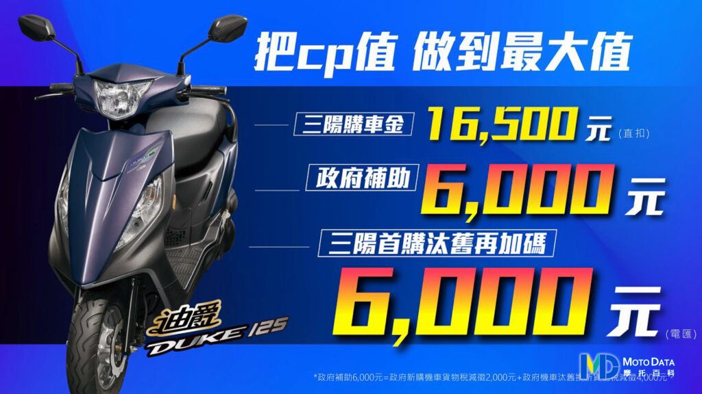 • 三陽首購汰舊換新再加碼 NT$ 6,000 元,採後續電匯方式扣除