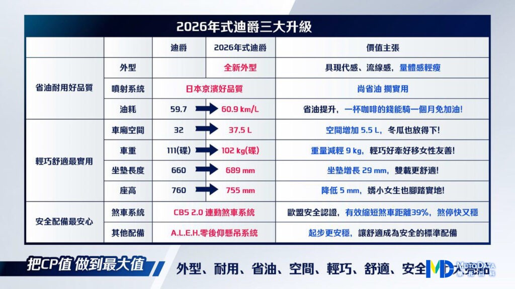 2026 迪爵 125 這次主打的就是性價比,特別提到油耗更省到 60.9km/L 且油箱加大至 6.5L 後,一杯咖啡的錢就能騎一個月不用加油,車箱空間提升至 37.5 公升、坐墊長度來到 689mm 以及座高降低至 755mm,這些都與全新迪爵 125 看齊,前腳踏空間 260mm 能放入一個登機箱尺寸,內裝置物杯架也有 700c.c. 手搖杯容量,碟煞版的車身重量也降低到僅只有 102kg,並且不論碟煞還是鼓煞版本,均標配 CBS 2.0 連動煞車系統,另外 2026 迪爵 125 也改善了引擎吊架,使用新款 A.L.E.H. 零後仰懸吊系統,軸距縮短至 1,252mm,車身更靈活。