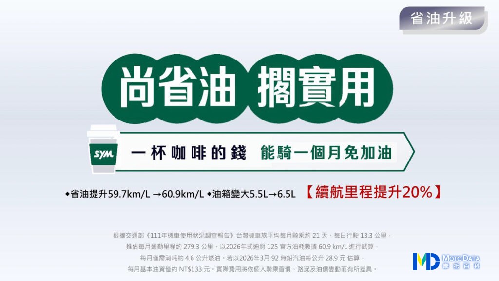 ◆根據交通部《111年機車使用狀況調查報告》台灣機車族平均每月騎乘約 21 天、每日行駛 13.3 公里,推估每月通勤里程約 279.3 公里。以2026年式迪爵 125 官方油耗數據 60.9 km/L 進行試算,每月僅需消耗約 4.6 公升燃油。若以2026年3月 92 無鉛汽油每公升 28.9 元 估算,每月基本油資僅約 NT$133 元。實際費用將依個人騎乘習慣、路況及油價變動而有所差異。