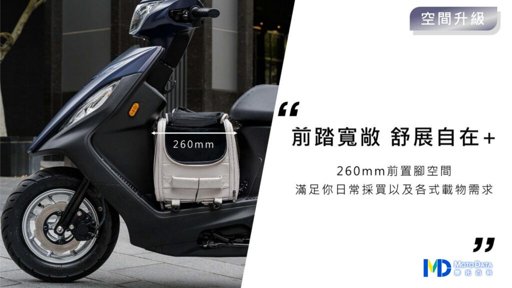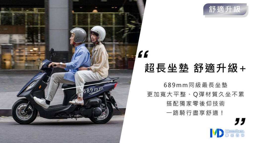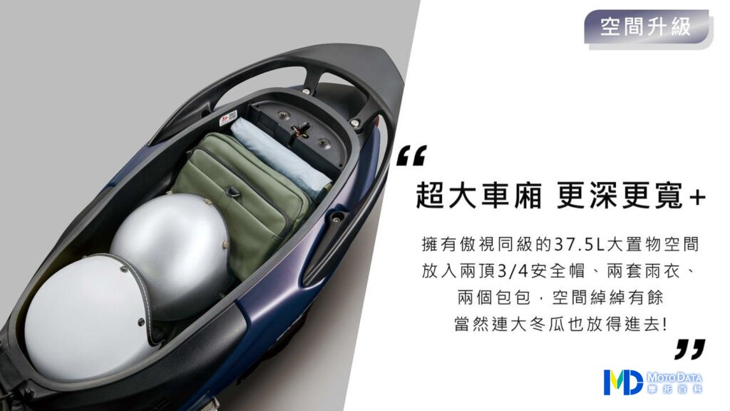 坐墊本身長度來到 689mm,座高則是 755mm,車箱空間也來到 37.5L,基本上這三個數據都比照全新迪爵 125 的規格,不僅雙載乘坐不會擁擠,座高對於女性也不會有太大困擾之外,車箱容量更是能放入兩頂 3/4 安全帽,實用性非常好。