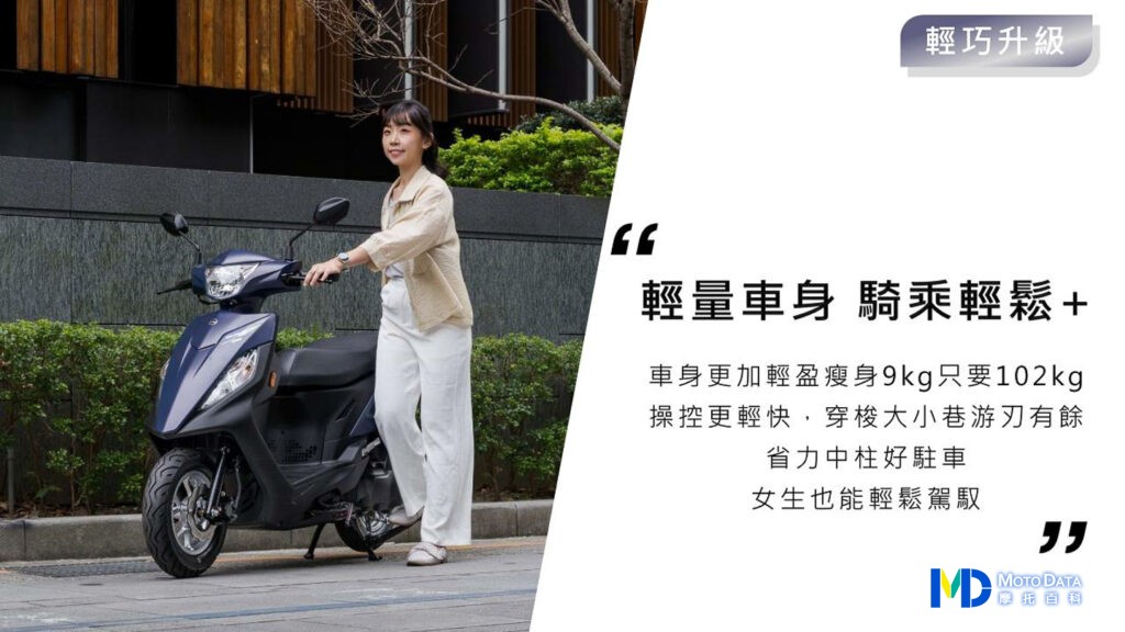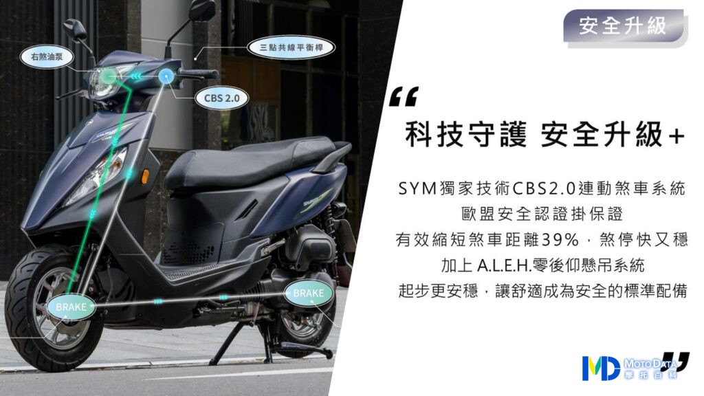 • 標配 CBS 2.0 連動煞車,升級新款 A.L.E.H. 零後仰懸吊系統,軸距縮短至 1,252mm