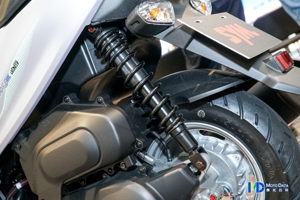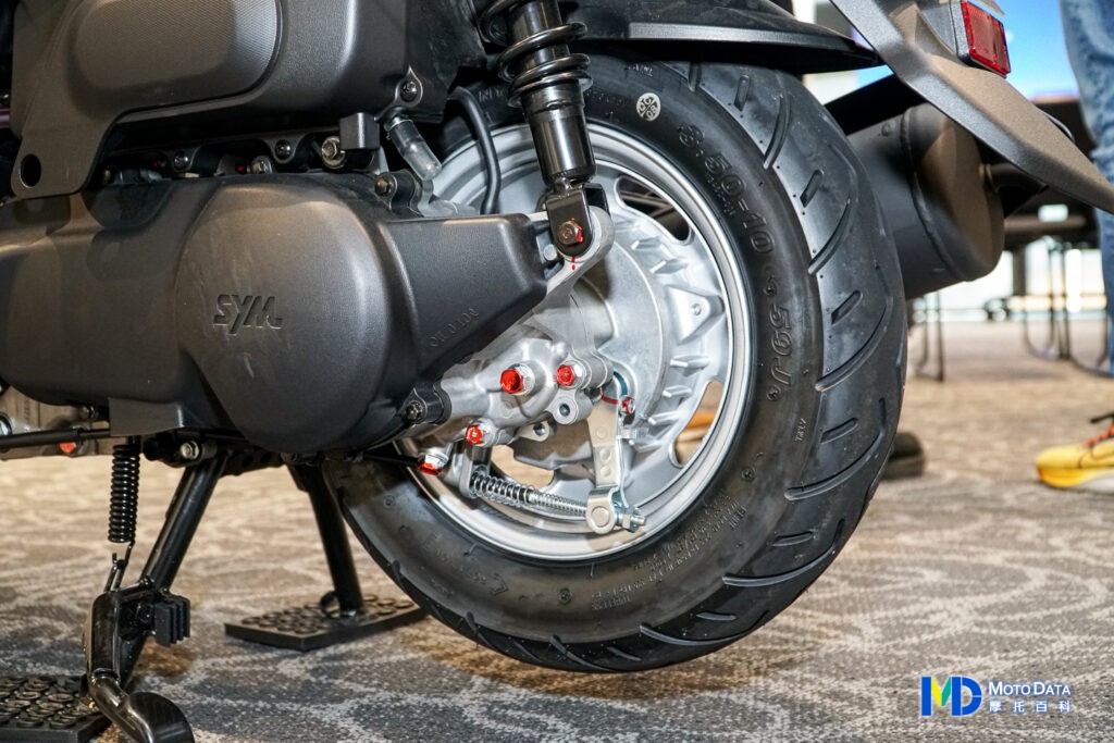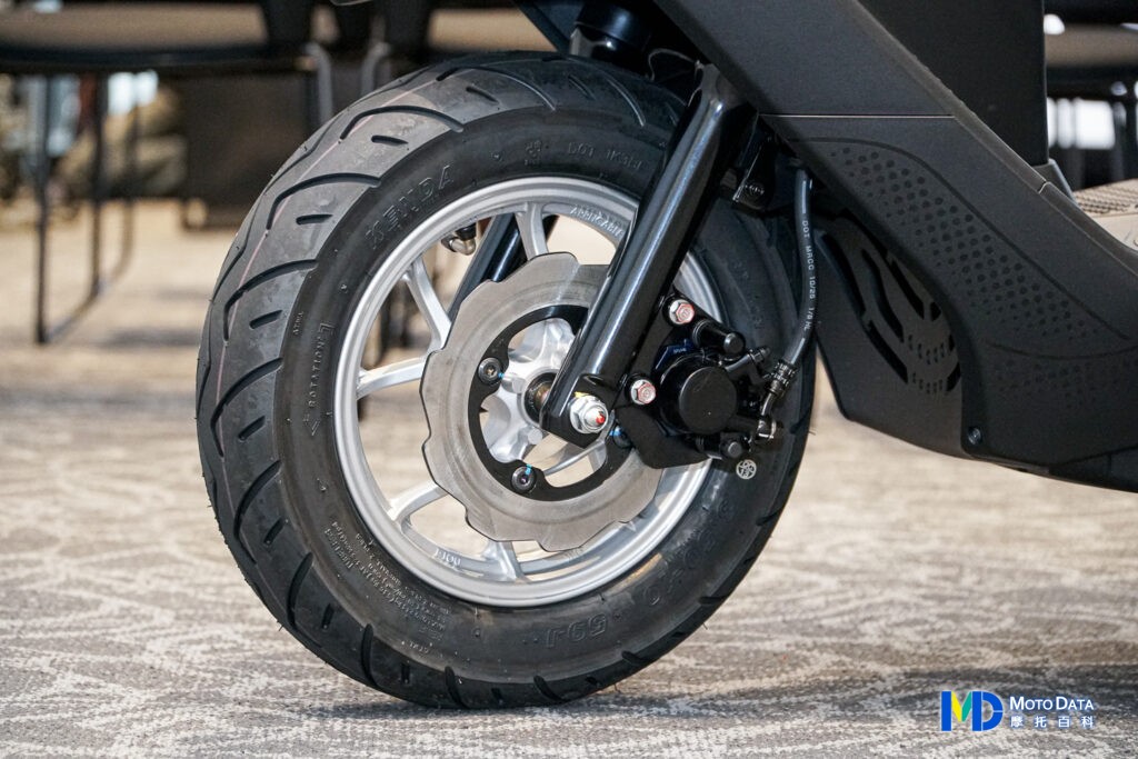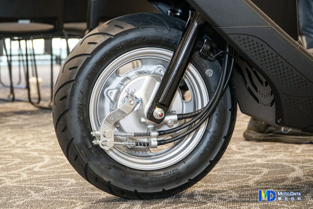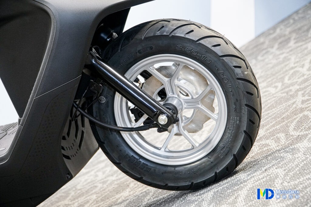 前輪方面使用的是 10 吋輪框組,碟煞版本的輪框與全新迪爵 125 採用相同造型鋁框,而鼓煞版本則是使用鐵框,前輪規格為 3.5-10,至於碟煞版本的制動系能方面,配備單向單活塞浮動式卡鉗,搭配 190mm 的固定式碟盤,碟盤未有排塵孔。