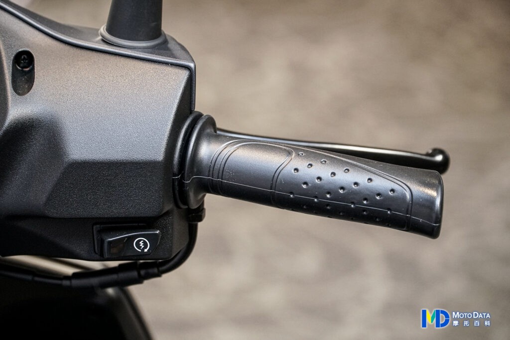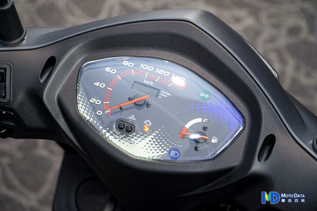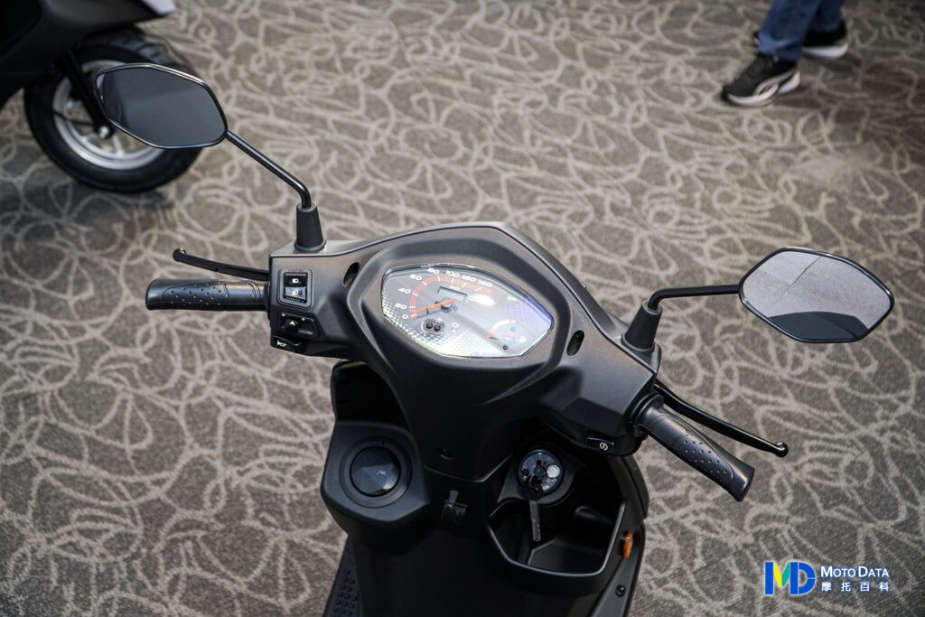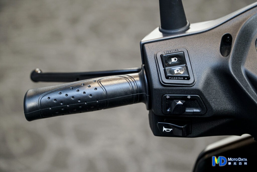 騎乘視角方面,儀錶板依然是配有小型液晶顯示的雙指針儀錶板,液晶顯示區域可顯示時間、電瓶電壓、總里程、單趟里程與機油里程,左邊把手燈型控制開關配有超車燈機能,右邊把手可見只有電啟動開關,無大燈開關組。