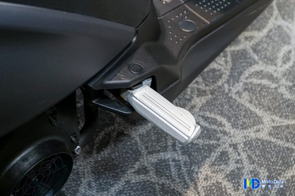 腳踏空間前後長度共有 270mm 長,可以輕鬆放入 21 吋登機箱尺寸行李箱,也可以放貓或者小型狗之類的寵物外出籠,並且腳踏前端有斜面,長途騎乘時也有伸展空間,後座則是使用飛旋踏板組。
